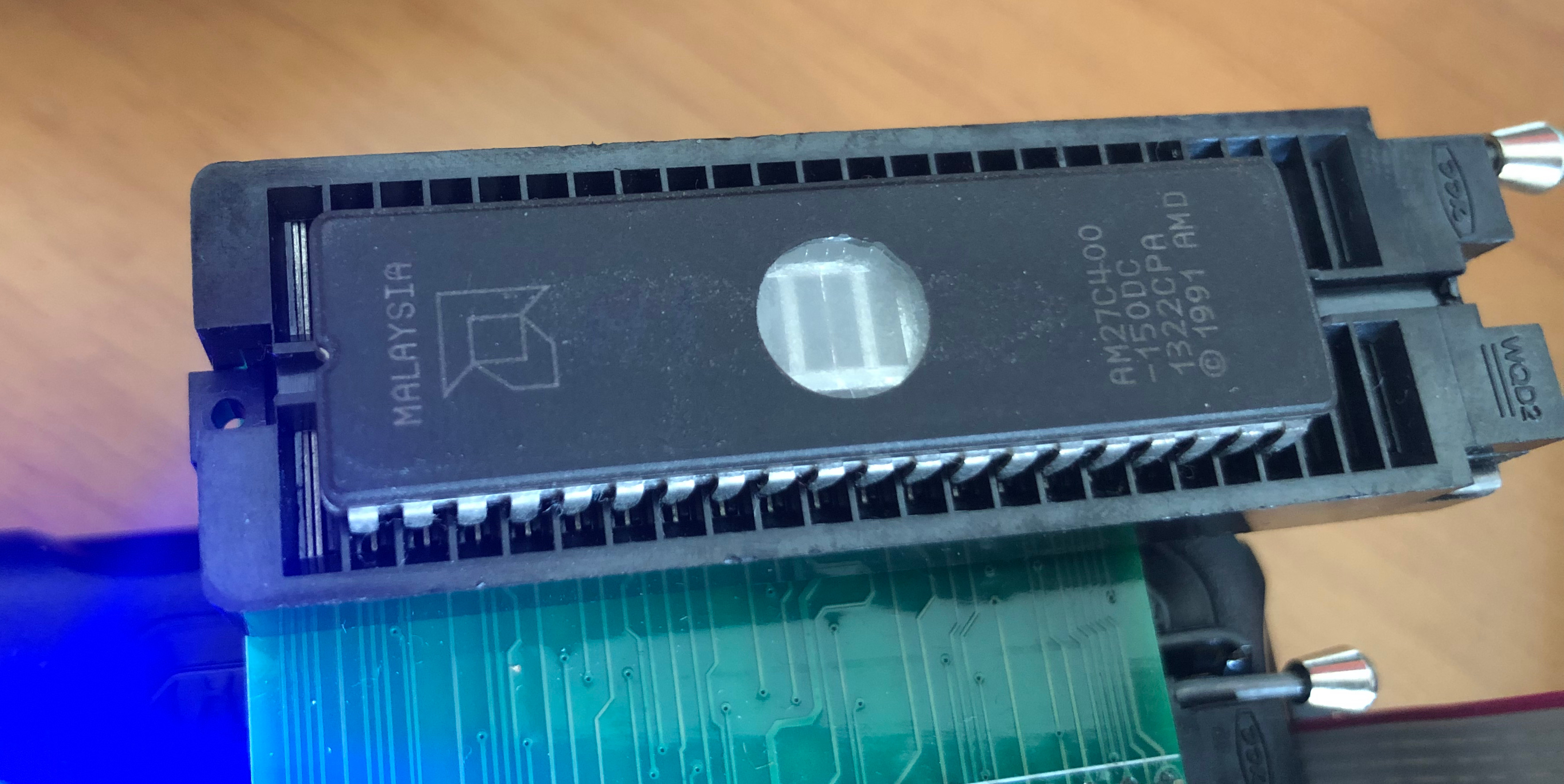 La velocità si può leggere dalle informazioni stampate sulla EPROM sulla seconda riga sotto la scritta AM27C400. Quelle più comuni hanno stampato 120DC -> accesso a 120 ns, oppure 150DC -> accesso a 150 ns.